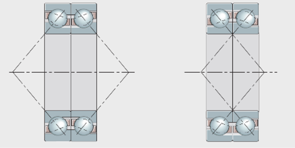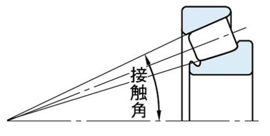 接触角に角度がついておりラジアル荷重と1方向のアキシャル荷重を受けることが出来ます。大抵は2個組み合わせで使用され、内部隙間の無い予圧のかかった状態で使用できるので特に精密な回転を要求する場合やスラスト方向の力がかかる場合などに向いています。接触角の違いで高速で回転できる物もあります。