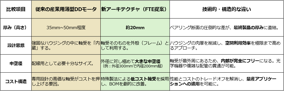 市場には既に「薄型」を謳う優れた産業用DDモータが存在します。それらと、我々が目指す新アーキテクチャは何が違うのでしょうか?