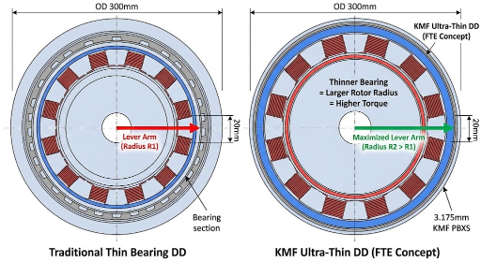 ■新アーキテクチャ: 断面わずか3.175mmの軸受を最外周ギリギリに配置します。これにより、磁気回路を可能な限り外側に寄せることができ、有効半径(レバーアーム)が最大化されます。 結果として、同じ体積、同じ磁力であっても、幾何学的に「より大きなトルク」を発生させることが可能になります。