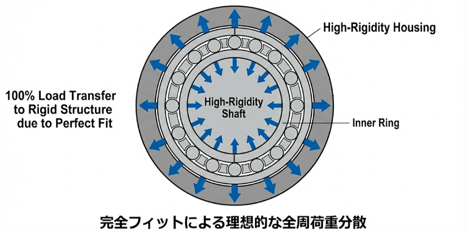 もし、あなたが設計したハウジングと軸が、十分な強度と精度を持っていたらどうなるでしょうか? ベアリングの内外輪は、相手部品の表面に隙間なく密着します。これにより、荷重が特定の点に集中することなく、ハウジング全体へと理想的に分散・伝達されます。 「完全剛体」に近い堅牢なハウジングを用意できた時、スリムスプリットベアリングはその柔軟性ゆえに、カタログスペック上の高い定格荷重を余すところなく発揮し、驚異的な耐久性を実現するのです。