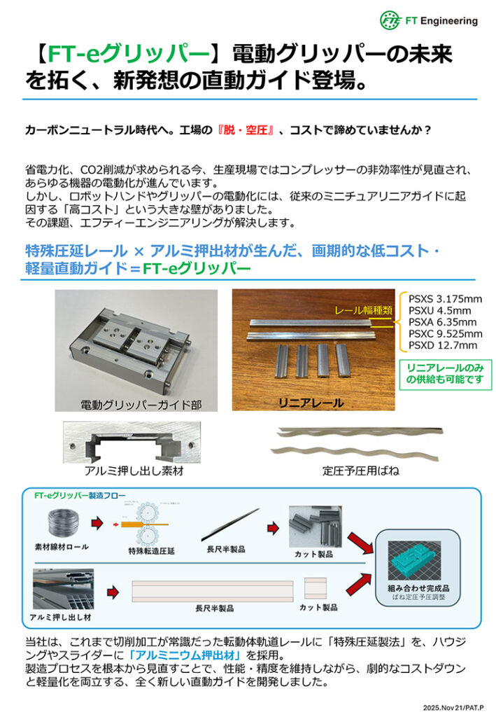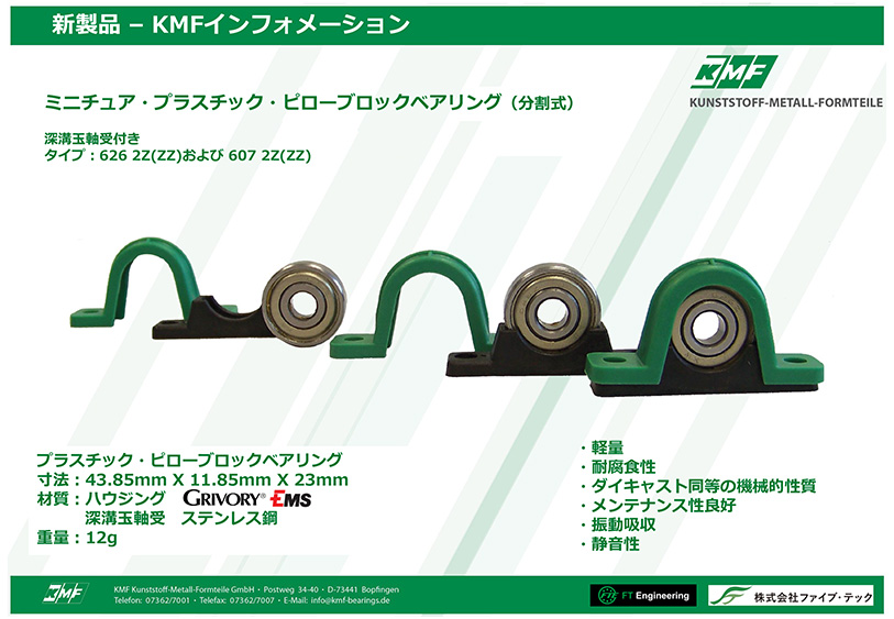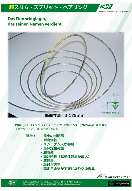 コンテンツ一覧 Toggle KMF製品別カタログ製品紹介チラシ総合カタログ KMF製品別カタログ リニアベアリングケージ直動用の保持器シリーズ各種 ボールベアリングケージ回転用の保持器シリーズ各種 転がり軸受アンギュラーローラー軸受アンギュラーローラーベアリングSRE ラジアルニードルローラーケージKKBFアキシャル用ローラーの金属製保持器 ニードルローラーベアリングKEBFニードルローラーと転送面リングのセット アキシャルスラストローラーベアリングASXKアキシャルベアリングの保持器と転送面セット アキシャルローラーケージAXK(樹脂)アキシャル用ローラーの樹脂製保持器 アキシャルローラーケージAXK(金属)アキシャル用ローラーの金属製保持器 アンギュラーコンタクトボールベアリングSKEアンギュラー玉ベアリング アキシャル‐ラジアルころ軸受テーブル用3ローラーベアリングYRA ワイヤーレースボールベアリング・旋回輪旋回輪ギア付き、アルミハウジング対応 リニアクロスローラーケージスリップレスシステムSLS搭載クロスローラーのリニアガイド保持器のみで販売できます。ズレ、落下しないスリップレスシステム搭載 超スリムスプリットベアリング極薄3.175mm断面の超薄肉ベアリングで直径1mも可能 ミニチュアプラスチックピローミニチュアベアリングのピローで高性能樹脂ハウジングを持つ プラスチックフランジベアリングフランジに構成の樹脂を使用。スナップ式で取り付け工数削減 製品紹介チラシ スリム・スプリット・ベアリング(薄肉ベアリング)のメリット薄肉ベアリングの用途や特徴、優位性など紹介 KMFフリーカットシール自由切断シールで、最大直径に制限なし、異形シールや直線シールにも KMFスリムスプリット紹介スリムスプリットの断面バリエーションの紹介、直径は自由に設定可能です 樹脂製フランジベアリングねじ締め不要、軽量、取り付け簡単、クリーン環境に最適です。 低価格アルミハウジングベアリング内部のベアリングはスリムスプリットベアリングを採用。アルミ、プラスチックス、ステンレスが選べます。 電動グリッパー用直動ユニット【FT-eグリッパー】電動グリッパー用の直動ユニットです。カスタマイズ可能。高精度、高剛性、高耐久性 総合カタログ スリム・スプリット・ベアリング薄肉ベアリングの総合カタログ、他社製品互換表あり ワイヤー・ボール・ベアリングワイヤーレース薄肉ベアリングの総合カタログ、他社製品互換表あり スリムスプリットローラーベアリングクロスローラーベアリング及びアンギュラーローラー、アキシャルローラーベアリングシリーズ、 省スペースで高剛性を求める箇所へ FacebookXBlueskyHatenaCopy